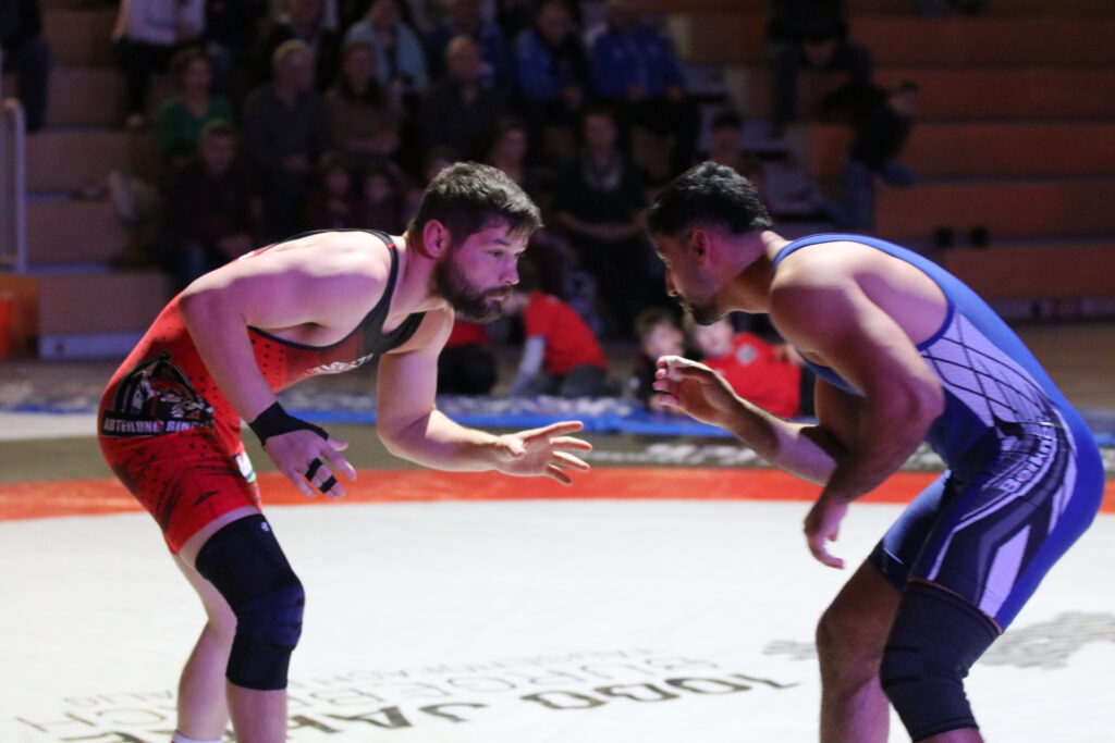 130 kg Freistil: Javan Palmer startete gut in den Kampf und ging durch einen Beinangriff und zwei Durchdreher am Boden in Führung. Danach kam sein Gegner jedoch in Schwung, passte sich Javans Ringweise an und schulterte ihn in der zweiten Halbzeit. (4:4)